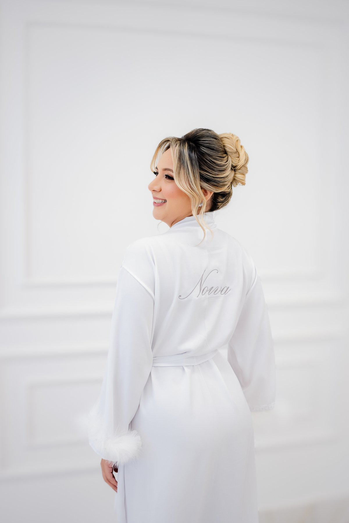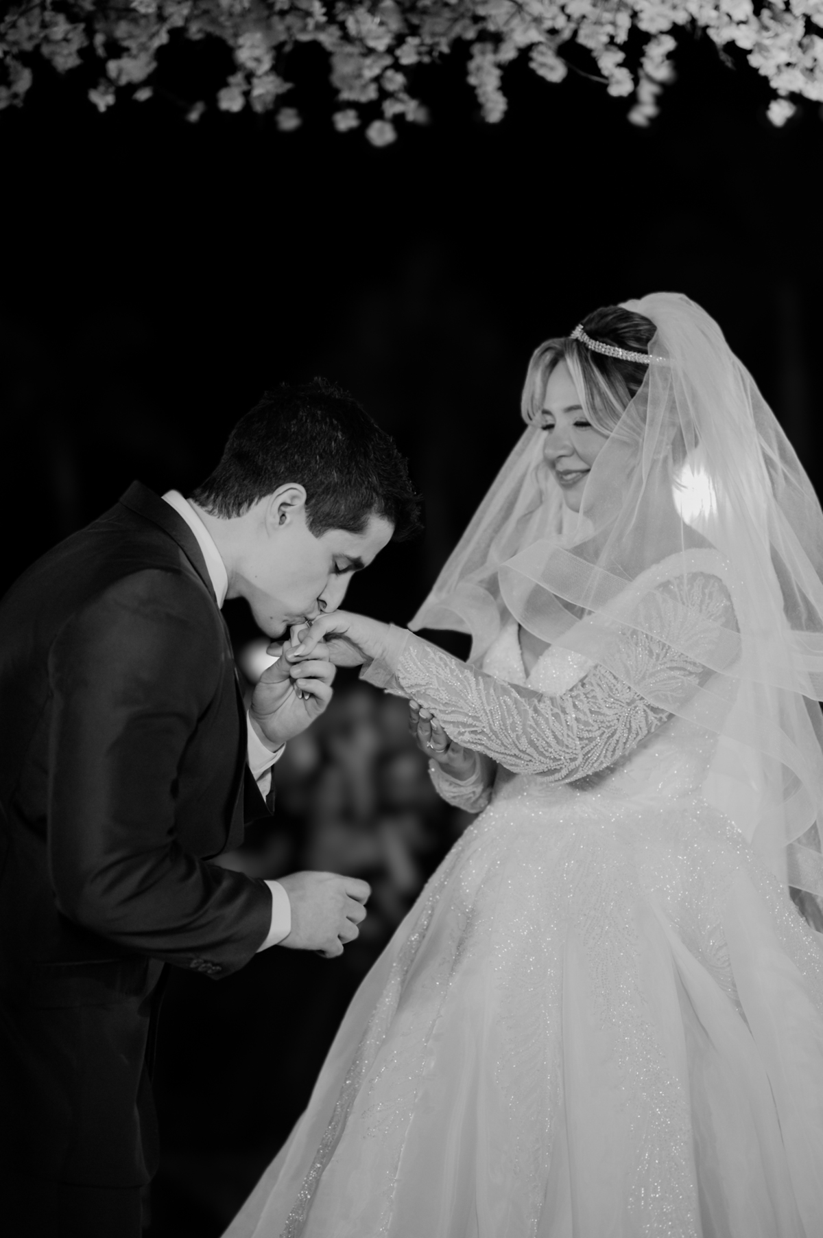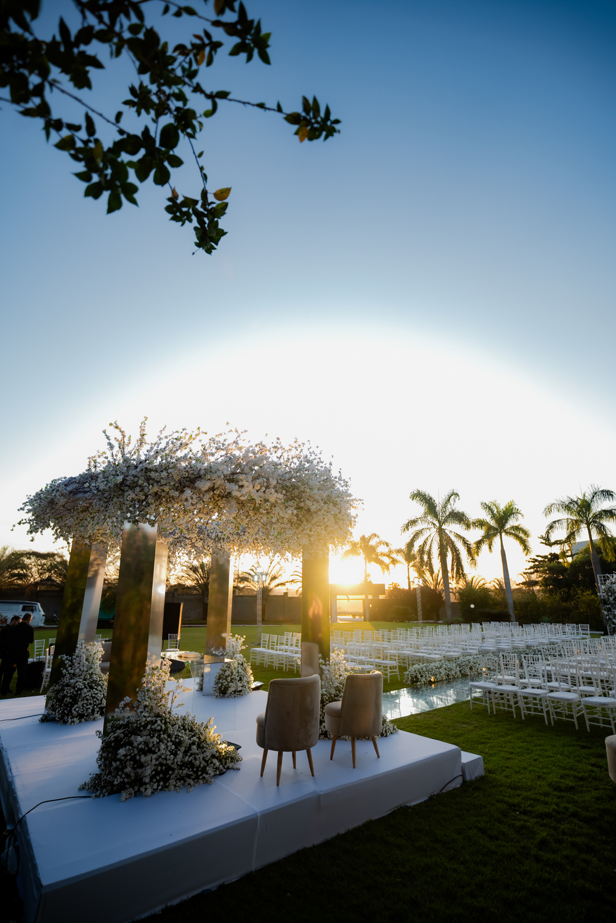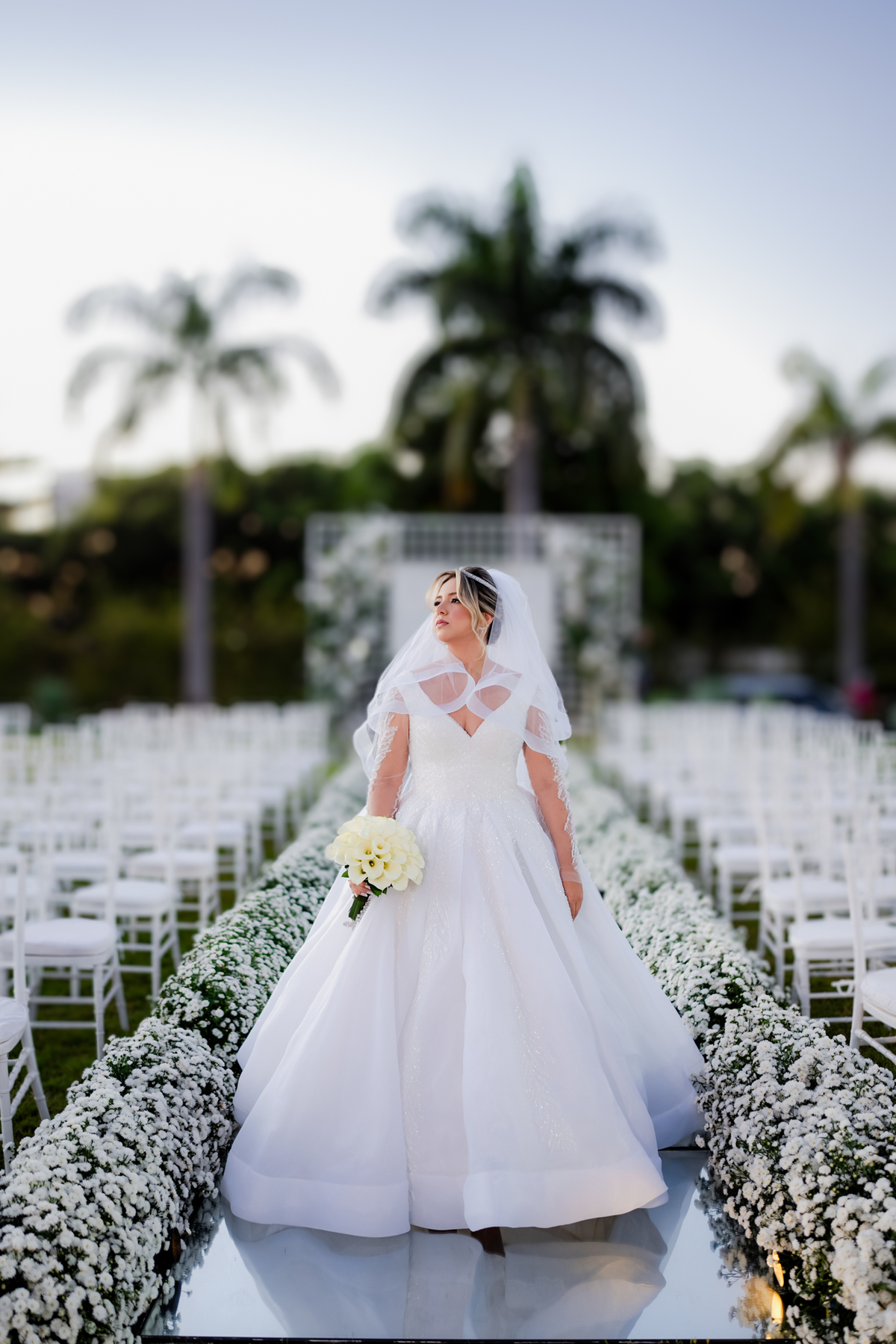 ✨ Realizado em um ambiente externo clássico e sofisticado, com flores brancas e uma estrutura em arco cromado no altar, o cenário foi digno de sonhos.